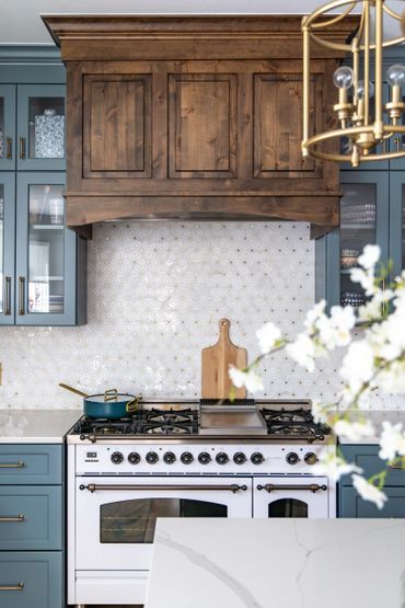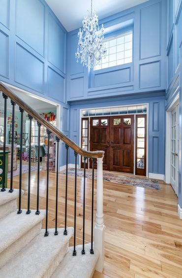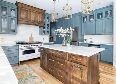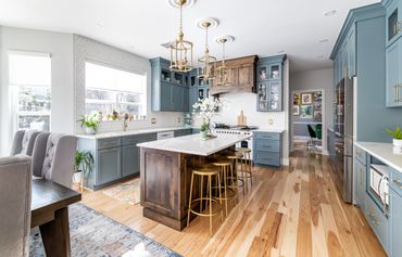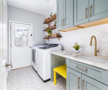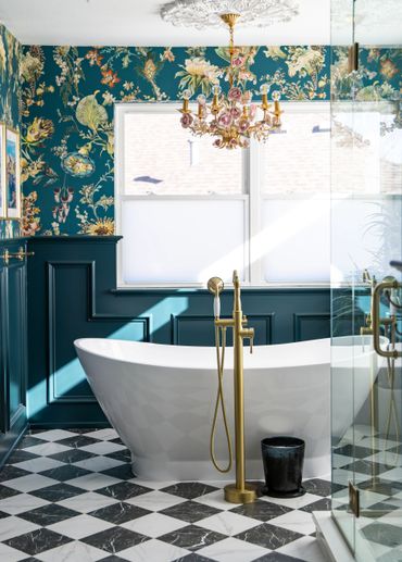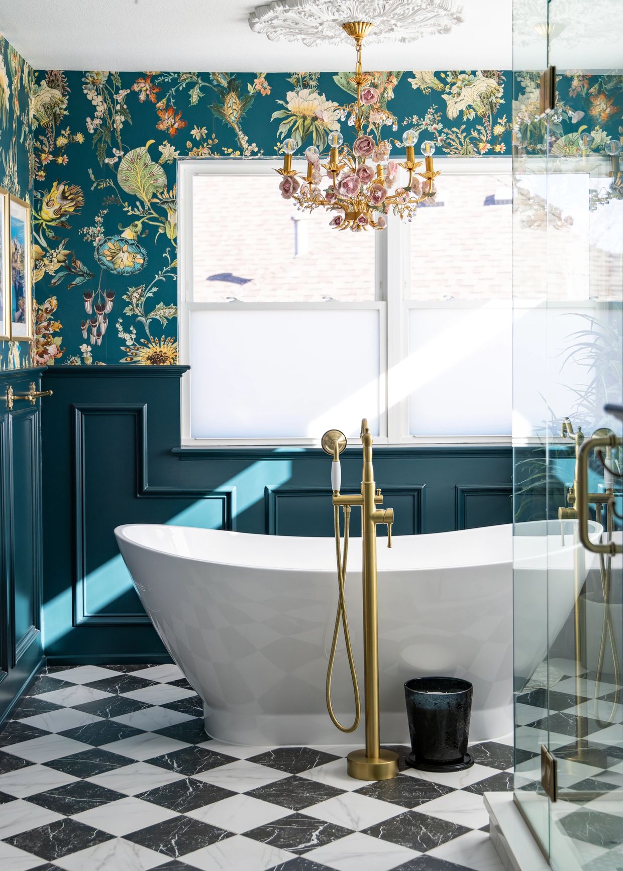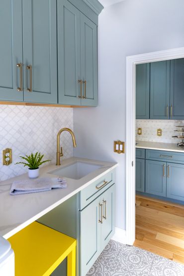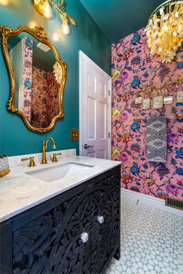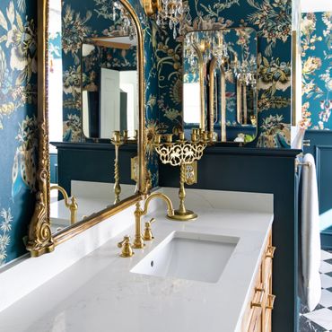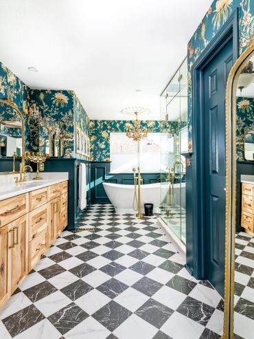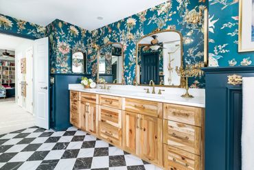 We had the pleasure of bringing this homeowner’s vibrant, eclectic vision to life. Throughout the home, she embraced a mix of various shades of blue, creating a bold, floral-inspired atmosphere. The entryway features a dual-level foyer with floor-to-ceiling blue wainscoting, making a striking first impression. The kitchen and laundry room beautifully combine rustic wood, shades of blue, and gold hardware, resulting in bright, clean, and inviting spaces. The bathroom, in particular, is a bold celebration of fearless design, where playful patterns and striking colors come together to create a one-of-a-kind space. This design blends elegance and playful sophistication, with a stunning marble checkerboard floor, gleaming gold accents, and vibrant colors that make the space unforgettable and full of personality.