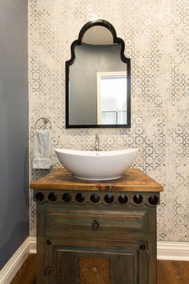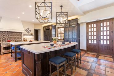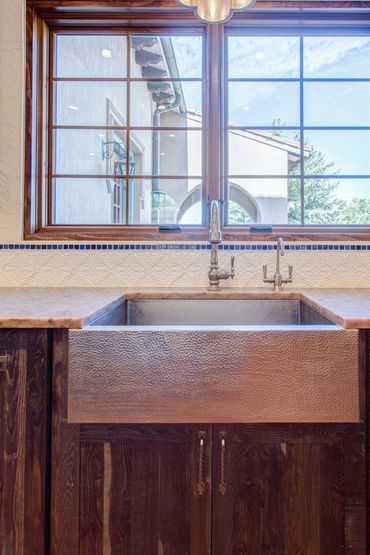 In this kitchen, two expansive islands provide both a cooking space and a dining area. The terracotta-colored floor tiles harmonize seamlessly with the blue and white backsplash, instilling a Spanish-style ambiance. Warm wood tones are integrated to evoke a farmhouse atmosphere. The sizable copper sink introduces a mixed-metal aesthetic, infusing character into the kitchen. The bathrooms lean slightly towards a modern feel, yet maintain an element of playfulness with rustic mosaic tiling.