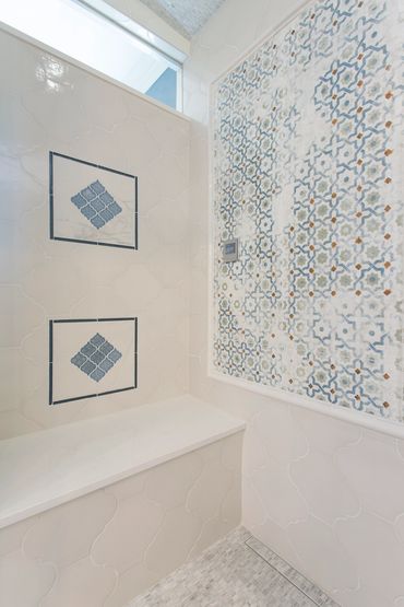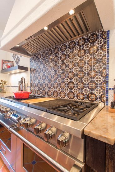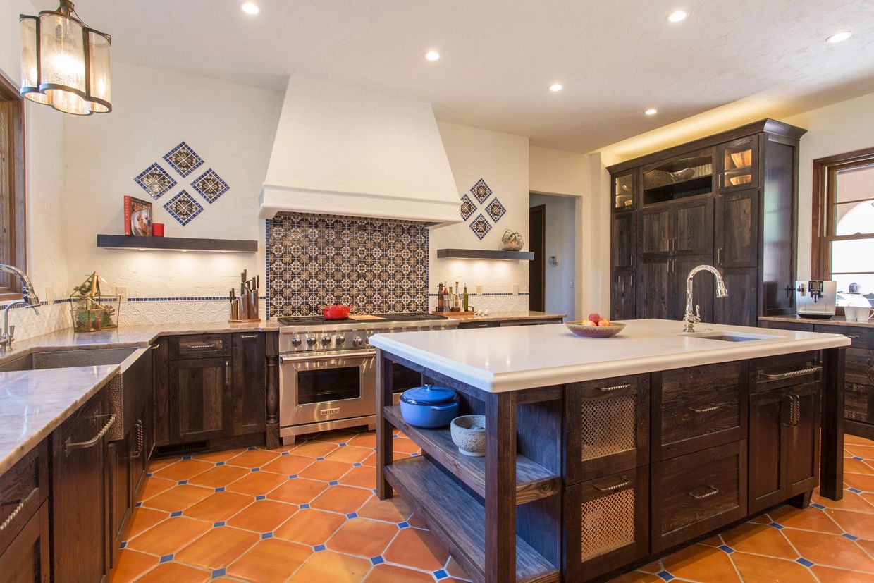 Tile plays a significant role in shaping the design of this project, conveying the desired Spanish-style ambiance that the client sought, from the flooring to the backsplash.