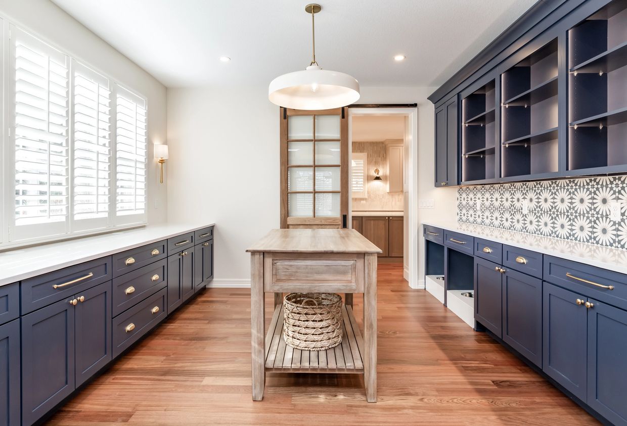 This home exudes a thoughtful blend of classic elegance and bold, personalized design. The butler’s pantry showcases deep navy cabinetry contrasted with a lively patterned tile backsplash, adding a touch of playful sophistication. Brass hardware and integrated pet feeding stations indicate both luxury and functionality. The kitchen continues the upscale yet warm aesthetic, featuring creamy cabinetry, brass accents, and a large professional-grade range under a custom hood with a rustic wood trim. The handmade zellige tile backsplash adds rich texture, while the warm wood flooring grounds the entire space with natural warmth.