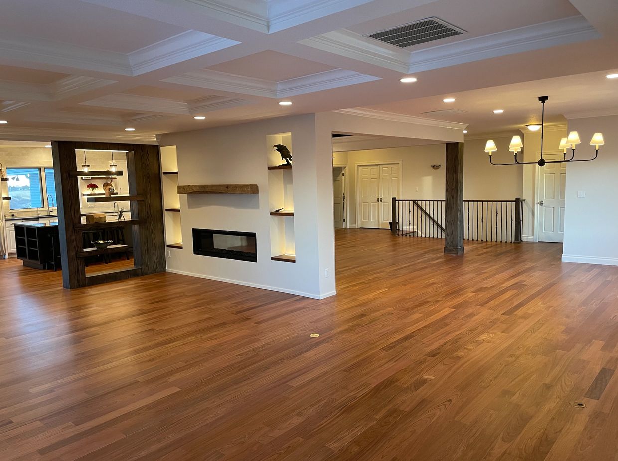 In Castle Pines, this stunning first-floor kitchen, dining, and living area exude a blend of modernity and rustic charm. The kitchen boasts a stylish mauve-green island complemented by white outer cabinets. Two countertop materials were used in the kitchen: granite on the island and black slate on the periphery. Enhancing ambiance, three glass pendants elegantly illuminate the island. Separating the main space, a dual-sided bookshelf and fireplace lend both functionality and aesthetic appeal. The warmth of carefully selected and custom-cut rustic wood completes the inviting atmosphere.