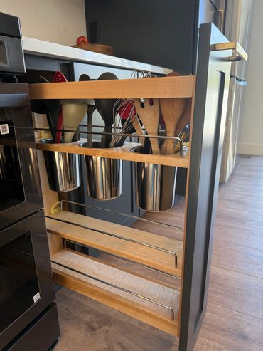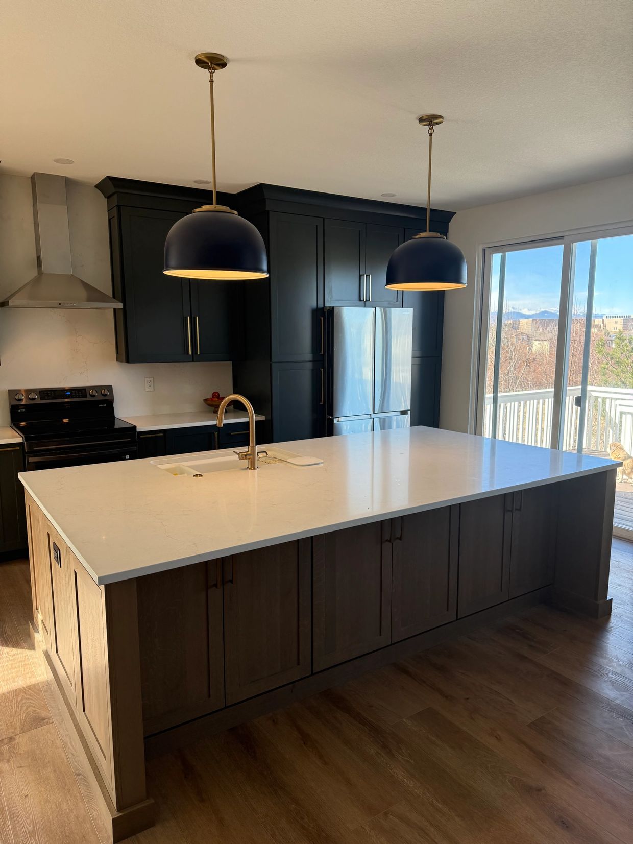 Where style seamlessly blends with functionality, this modern kitchen is thoughtfully designed to meet the needs of everyday family life. Tailored for a family-oriented client with children of all ages, the expansive island serves as the perfect space for both lively entertaining and intimate, cozy evenings spent together. The countertop material is thoughtfully extended up the wall behind the range hood, creating a visually cohesive and clean design, while avoiding the addition of unnecessary elements that might overwhelm the space. Every detail of this kitchen was meticulously planned to ensure a clutter-free environment, making it an ideal space for a busy family where organization is key, especially with the daily use of children.