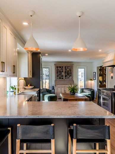 The Middlebury Dr project features a Scandinavian-style kitchen with sleek, modern lines. Playful curves and stylish lighting enhance the space with unique details.