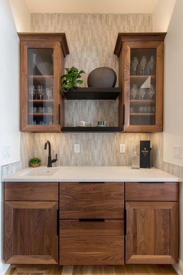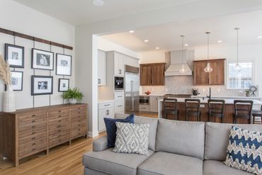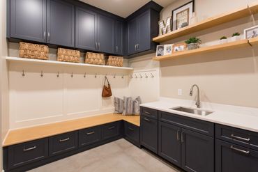 This kitchen embraces an open floor plan seamlessly merging the kitchen/dining area with the living room. A wet bar and prep area establish a connection from the formal living room to the kitchen, facilitating easy entertaining. The prep area includes refrigerated pull-out drawers for additional food storage. The kitchen exudes a bright and airy atmosphere with light grey cabinets, a wooden island, accent cabinets, and a white countertop. The laundry room features abundant storage with dark grey cabinets, along with a sink and countertop area, catering to the needs of families.