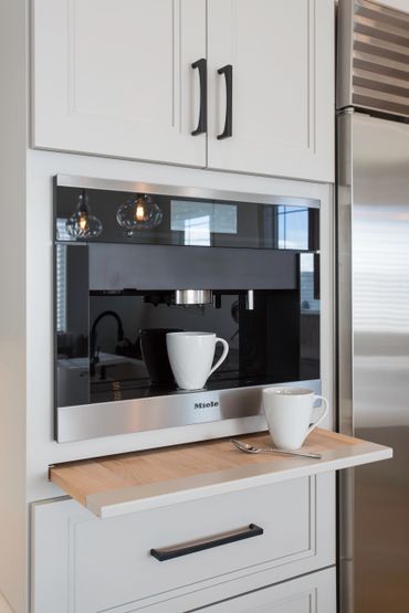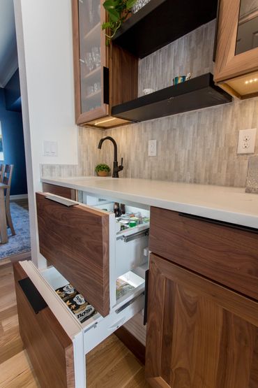 Natural light floods the space creating a bright and lively atmosphere. This is enhanced by the installation of lighting beneath the cabinets, accentuating both the countertop space and backsplash.