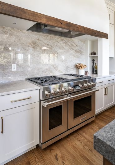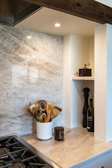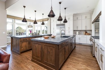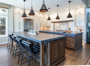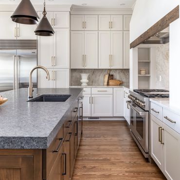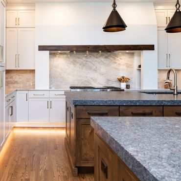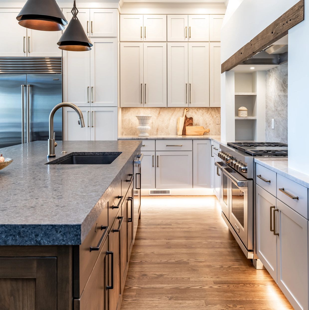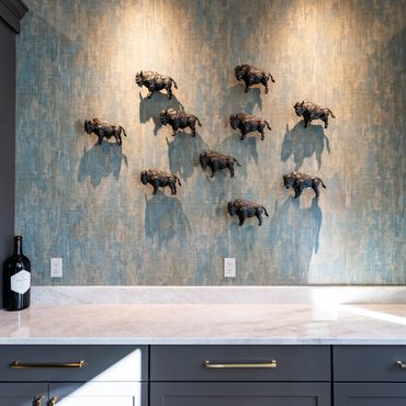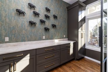 Every detail in this space was crafted with precision and character. The custom alcove hood is complemented by stunning stone shelves and under-counter lighting, blending functionality with style. The kitchen features two expansive islands that make it a host's dream—one serves as a prep area, while the other offers additional storage and seating. By selecting different cabinet finishes and countertop materials for the islands and perimeter, the design adds visual interest without overwhelming the space with a single aesthetic. To make the butler’s pantry stand out, we added bronze buffalo statues—a personal touch for our CU alumni clients. Discover how thoughtful design choices can elevate your home!